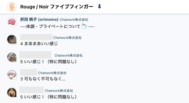 以下の専用チャットにて1~5を各自が投稿し、低い数字に対しては、チームとして何かできることはないか?を話し合っています。 「昨日見た映画が楽しかったから 5」や「所有している馬が勝ったから 5」、「冷蔵庫が壊れてしまったから 1」など、メンバーのプライベートが垣間見えたり、その後の雑談のきっかけになったりもして、開発者からも「楽しい」と評判のワークです。