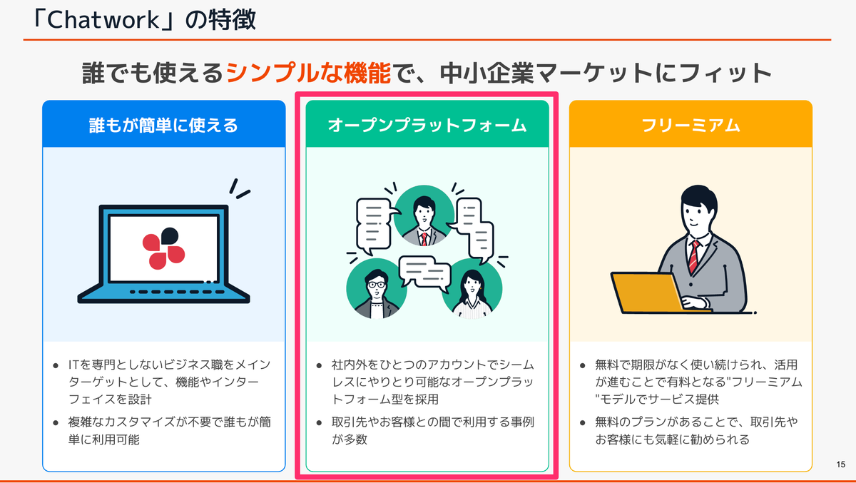 ここでいうオープンプラットフォーム性とは、たとえば Slack のようなビジネスチャットでは「ワークスペース」という概念がありますが、Chatwork にはそういった概念がない、ということです。